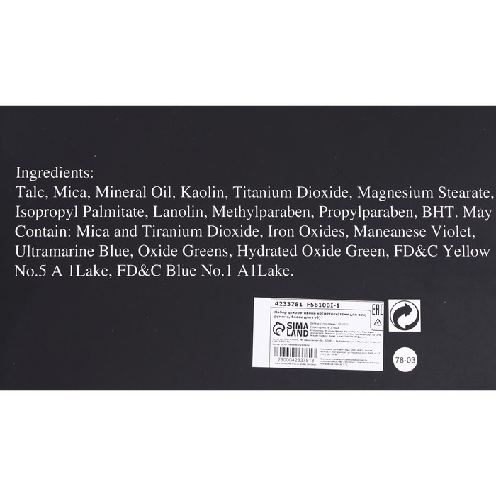 Состав: Talc, Mica, Oll, Kaolin, Tianium Dioxide, Magnesium Stearate, Isopropyl Palmitate, Lanolin, Methylparaben, Propylparaben, BHT. Может содержать: Maca and Titanium Dioxide, Iron Oxides, Manganesc Violet, Ultramarine Blue, Chrome Oxide Greens, Hydrated Chrome Oxide Green, FD&C Yellow No.5 Al Lake, FD&C Blue NO. 1 Al Lake.