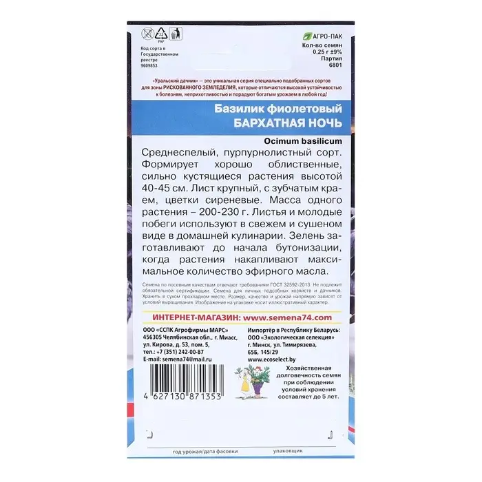 Семена Базилик "Бархатная ночь", фиолетовый, 0,25 г