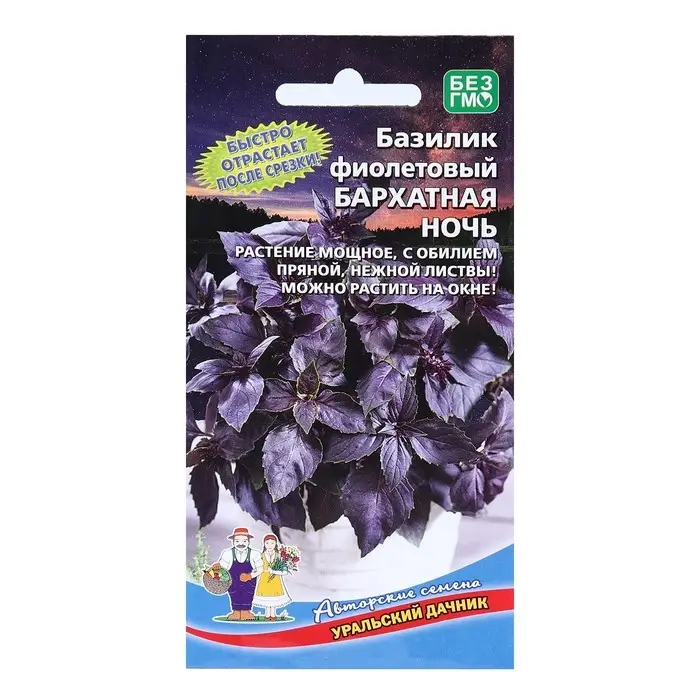 Некоторые травы имеют настолько приятный вкус и запах, что их жалко смешивать с другими пряностями. Прежде всего это относится к базилику. Бархатная ночь насыщенного фиолетового цвета, очень нежный и ароматный. Среднеранний сорт. Растение полураскидистое, хорошо облиственное, высотой 40-50 см. Листья крупные, жгуче-фиолетовые, пряные с сильным ароматом душистого перца. Масса одного растения 180-250 г. Желательно прищипнуть для лучшего кущения. Он прекрасно вырастет в квартире на солнечном окне.