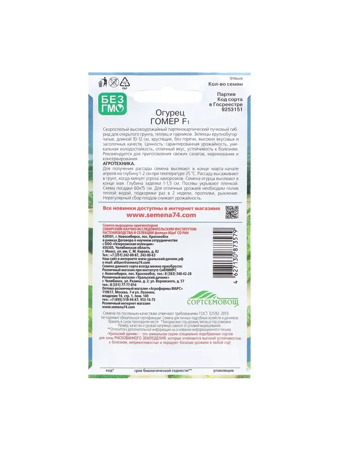 Скороспелый, высокоурожайный, партенокарпический, пучковый гибрид для открытого грунта, теплиц и парников. Зеленцы крупнобугорчатые, длиной 10-12 см, хрустящие, без горечи, высоких вкусовых и засолочных качеств. Ценность: гарантированная урожайность, уникальная холодостойкость, отличный вкус, устойчивость к болезням. Рекомендуется для приготовления свежих салатов, маринования и консервирования. Для получения рассады семена высевают в конце марта- начале апреля, на глубину 1-2 см, при температуре 25°C. Рассаду высаживают в грунт, когда минует угроза заморозков. Семенами огурец высевают в конце мая. Глубина заделки 1-1,5 см. Посевы укрывают плёнкой. Схема посадки 60х15 см. Для отличных урожаев необходим полив тёплой водой, подкормки раз в 2 недели, прополки, рыхление. Нерегулярный сбор плодов сни- жает урожайность.