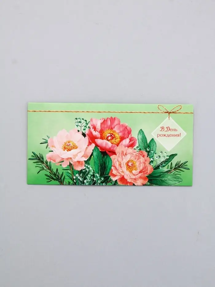 Конверт для денег «В День Рождения!», 3 цветка на зелёном, 16,5 х 8 см