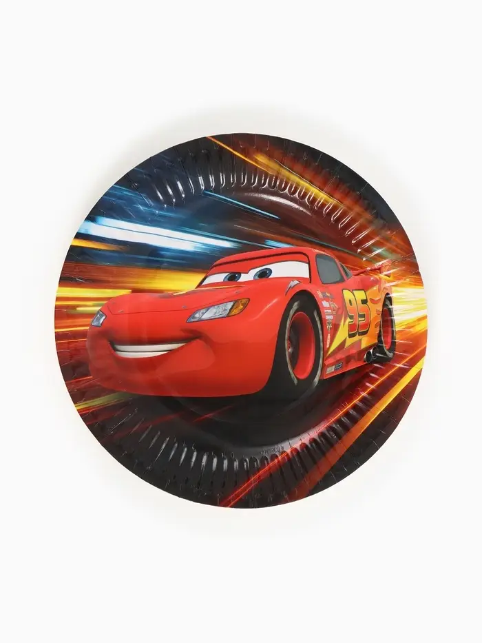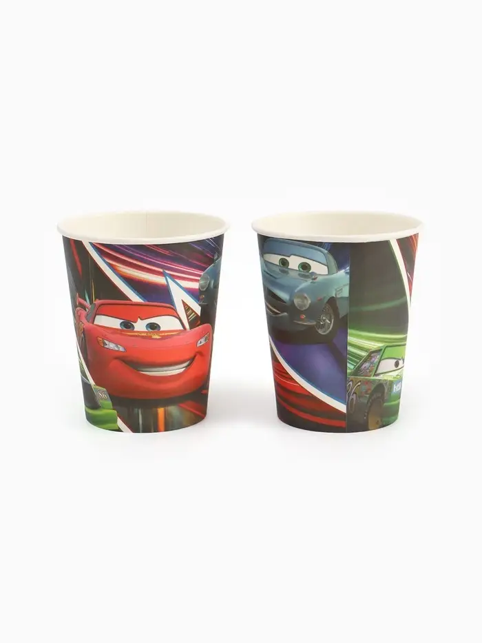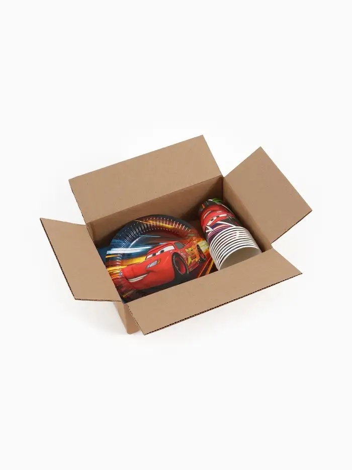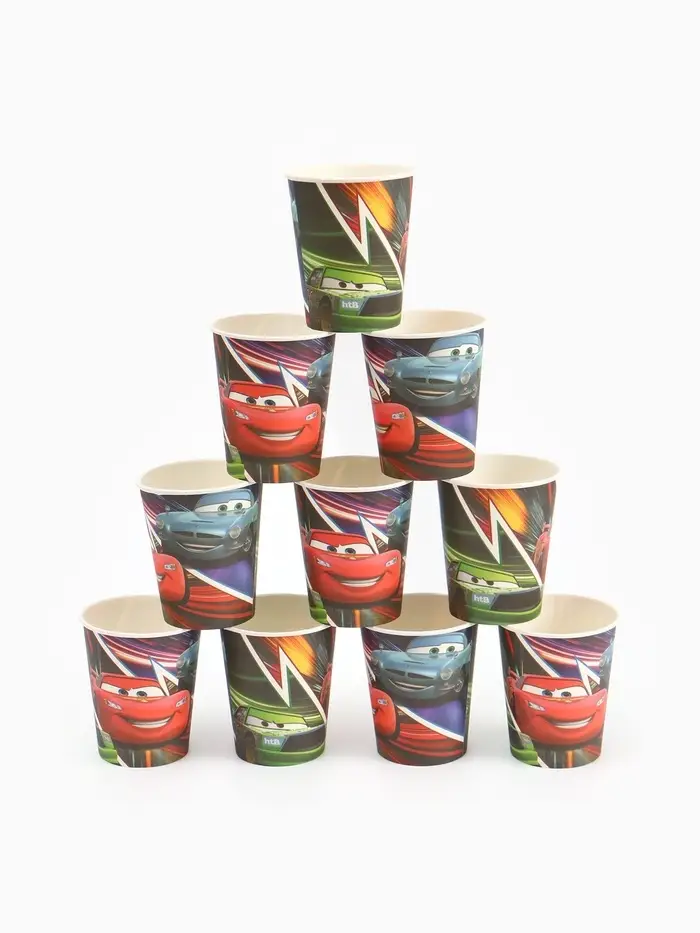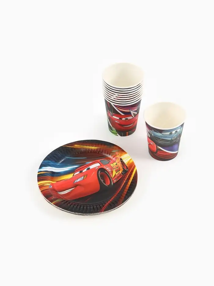 Посуда одноразовая бумажная на 10 персон: стаканы, тарелки, скатерть, Машинки