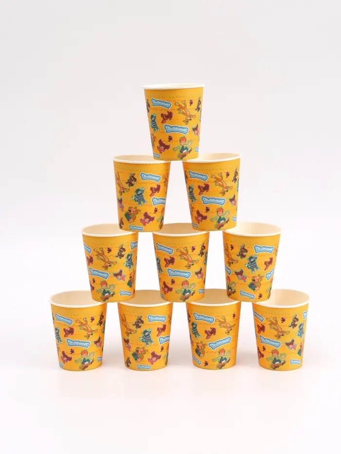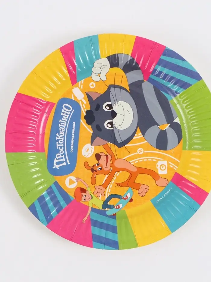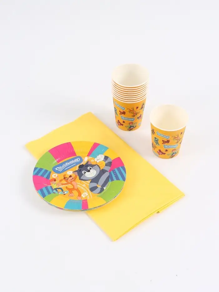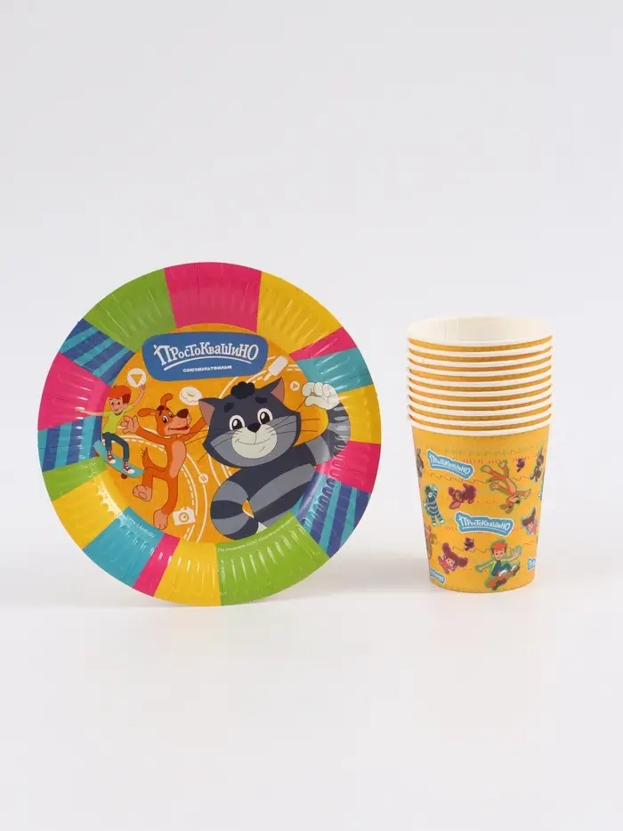 Посуда одноразовая бумажная на 10 персон «Простоквашино»: стаканы, тарелки, скатерть, Союзмультфильм