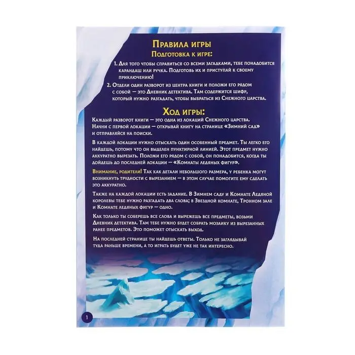 Каждый разворот книги — это одна из локаций Снежного царства. В них нужно отыскать один особенный предмет. Найти его не сложно, ведь он выделен пунктирной линией. Аккуратно вырежьте его!