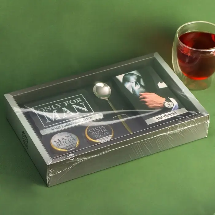 Набор Only for man: крем-мед с апельсином и хлопком, орехи в шоколадной глазури 70 г., чай чёрный, ложка