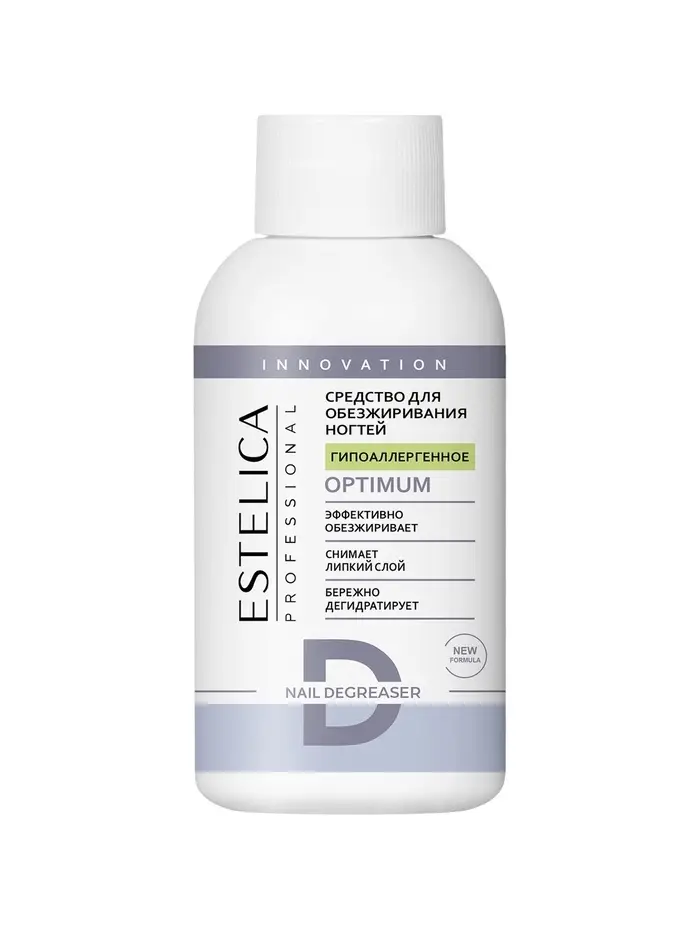 ESTELICA PROFESSIONAL OPTIMUM, средство для обезжиривания и снятия липкого слоя 100 мл (20 шт.) — профессиональное гипоаллергенное средство, которое обеспечивает надёжное сцепление материалов с ногтевой пластиной и предотвращает сколы и отслоения покрытия. Средство эффективно удаляет дисперсионный (липкий) слой и дегидратирует ногтевую пластину, что делает его незаменимым при работе с натуральными и искусственными ногтями перед нанесением акрила, геля или лака.