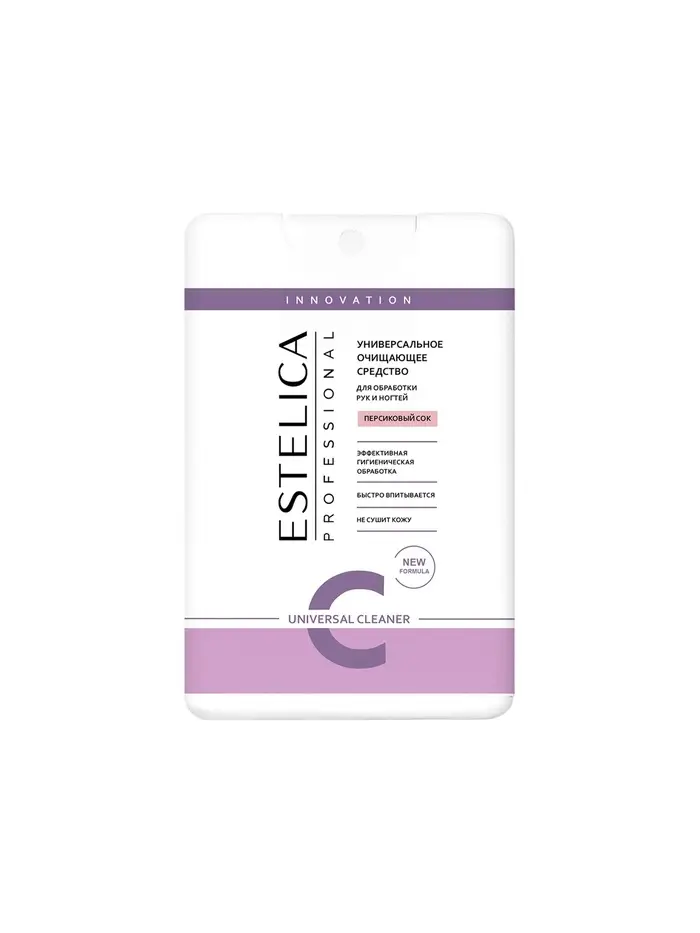 ESTELICA PROFESSIONAL, универсальное очищающее средство 20 мл — Персиковый сок — эффективное средство для гигиенической обработки рук и ногтей, а также рабочих поверхностей и маникюрных инструментов. Обладает приятным ароматом персика, быстро впитывается, не требует смывания и не сушит кожу.