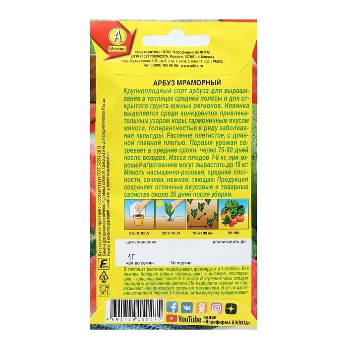 Крупноплодный сорт арбуза для выращивания в теплицах средней полосы и для открытого грунта южных регионов. Новинка выделяется среди конкурентов привлекательным узором коры, гармоничным вкусом мякоти, толерантностью к ряду заболеваний культуры. Растение плетистое, с длин ной главной плетью. Первый урожай созревает в средние сроки, через 75-90 дней после всходов. Масса плодов 7-8 кг, при хорошей агротехнике могут вырастать до 15 кг. Мякоть насыщенно-розовая, средней плотности, сочная, нежная, тающая. Продукция сохраняет отличные вкусовые и товарные свойства около 35 дней после уборки.