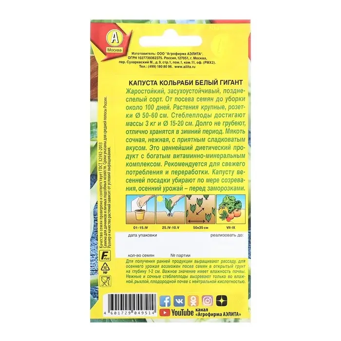 Семена Капуста Белый гигант кольраби. Позднеспелый сорт, от посева семян до технической спелости около 100 дней. Растения крупные, розетки в диаметре 50-60 см. Стеблеплоды массой около 3 кг, O15-20 см. Очень долго не грубеют, способны к длительному хранению в зимний период. Мякоть сочная, нежная, с богатым содержанием витаминов, полезных минералов и клетчатки, с приятным сладковатым вкусом. По усвояемости витаминов превосходит яблоки. Рекомендуется для свежего потребления и кулинарной переработки. Отлично сочетается с другими овощами в витаминных салатах, употребляется также в тушеном, отварном, жареном, запеченном и консервированном виде. Кольраби особенно полезна детям.