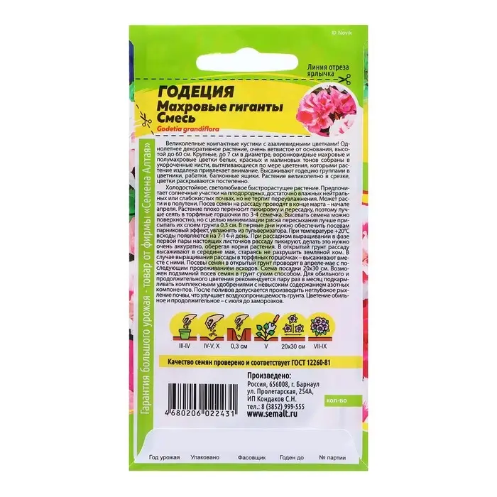 Великолепные компактные кустики с азалиевидными цветками! Однолетнее декоративное растение, очень ветвистое от основания, высотой до 60 см. Крупные, до 7 см в диаметре, воронковидные махровые и полумахровые цветки белых, красных и малиновых тонов собраны в укороченные кисти, вытягивающиеся по мере цветения, которыми растение издалека привлекает внимание. Высаживают годецию группами в цветники, рабатки, балконные ящики. Растение великолепно в срезке, цветки раскрываются постепенно. Холодостойкое, светолюбивое растение, отзывчиво на полив и подкормки. Предпочитает солнечные участки, переносит полутень, хорошо растет на плодородных, достаточно влажных почвах. Посев семян проводят в апреле-мае в открытый грунт. Глубина заделки семян 0,5 см. При температуре +20°C всходы появляются на 7-14-й день, их прореживают на расстоянии 15-20 см. Зацветает через 2,5-3 месяца после посева, цветет обильно с июля по октябрь.
