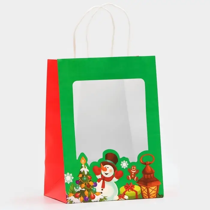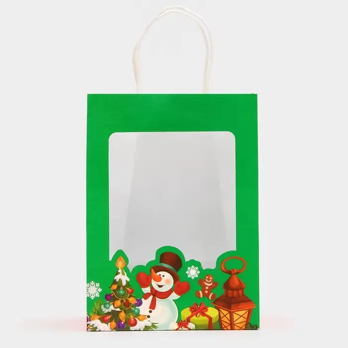 Пакет подарочный бумажный с окном «Снеговик» 19×26×13 см, крафт зеленый