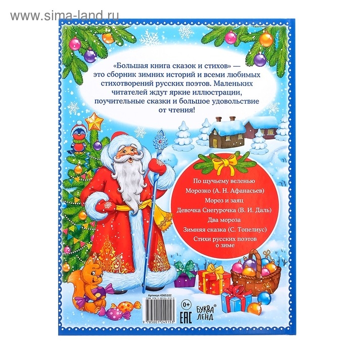 «Большая книга сказок и стихов» подарит малышу новогоднее настроение. В сборник входят стихи о зиме А. Пушкина, Ф. Тютчева, С. Есенина и А. Фета, сказки В. Даля и А. Афанасьева.