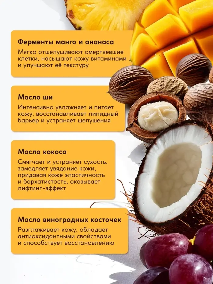 - Натуральный экстракт манго и порошок ананаса насыщают кожу антиоксидантами, придавая ей сияние и свежесть