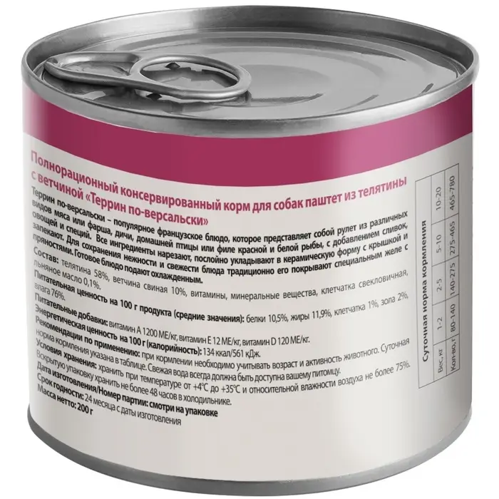 - Банка 200 г — одна порция, одна цель: Объём рассчитан на одно полноценное кормление средней собаки. Удобно использовать для точного контроля порции, не оставляя лишнего.