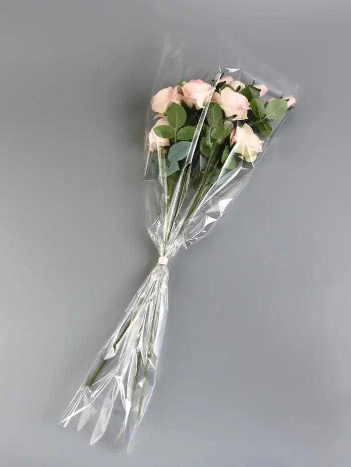 - Прозрачный БОПП: Материал пропускает свет, подчеркивая красоту цветов. Пленка прочная, не рвется при контакте с декоративными элементами.