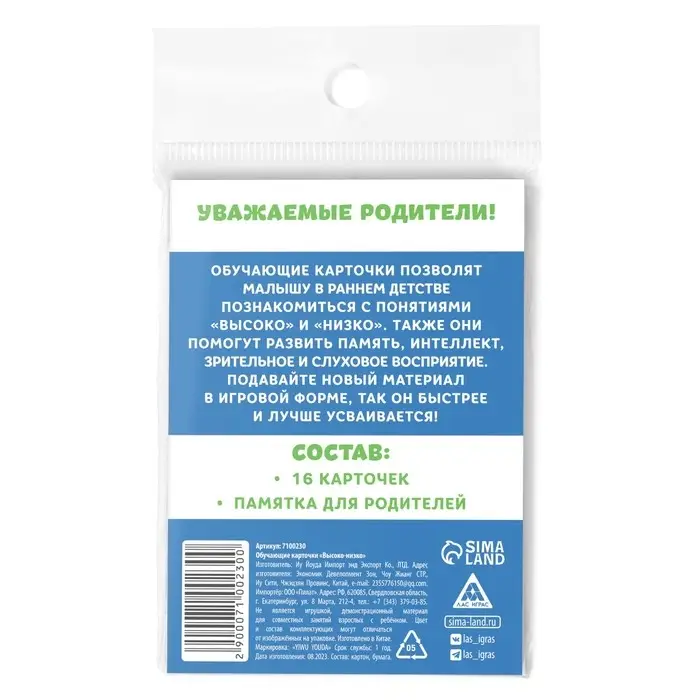 Обучающие карточки позволят малышу в раннем детстве познакомиться с понятиями «высоко» и «низко». Также набор поможет ребёнку развить память, интеллект, зрительное и слуховое восприятие. Подавайте новый материал в игровой форме, так он быстрее и легче усваивается.