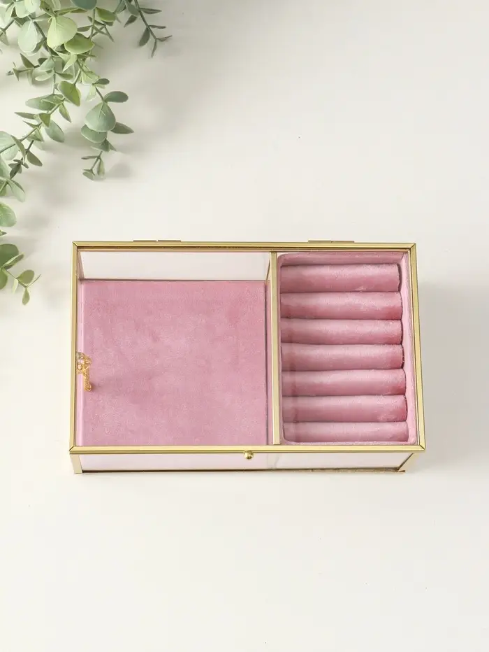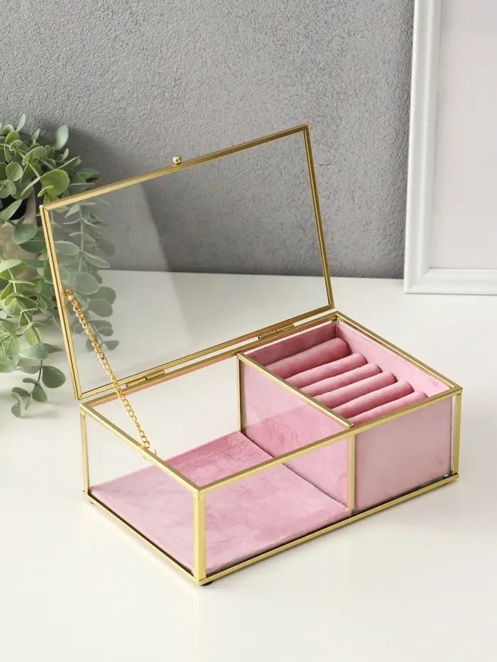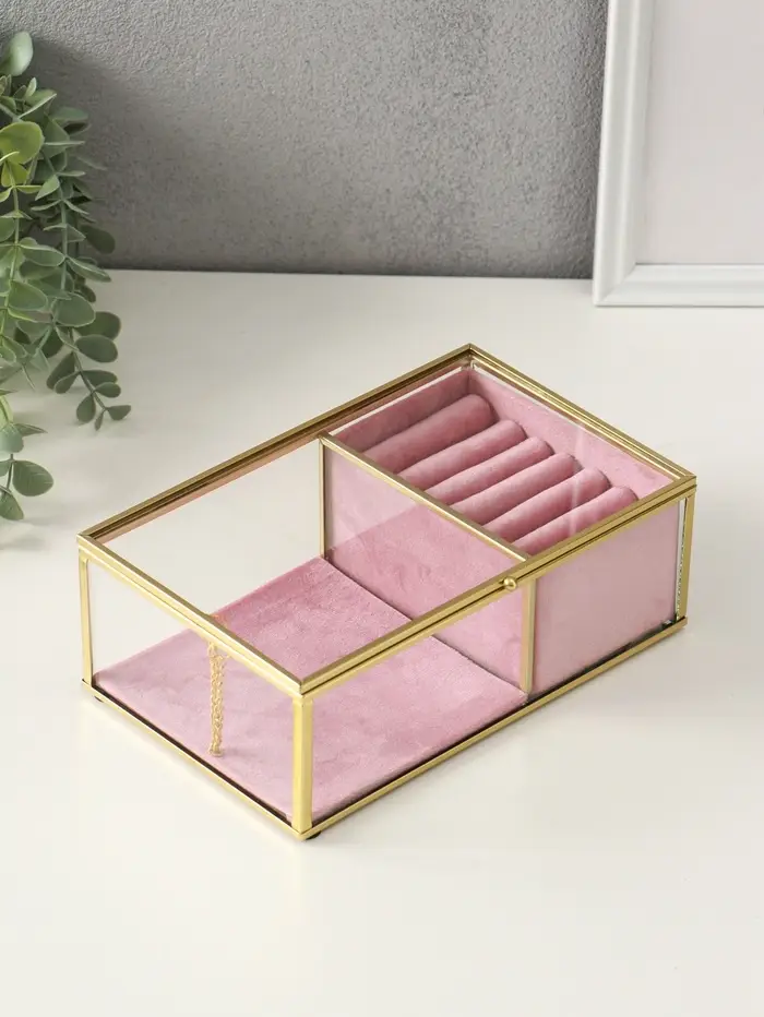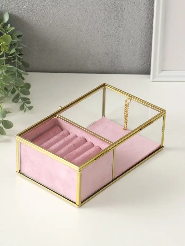 Шкатулка стекло с металлическим каркасом "Розовая" 2 отделения 22х14,5х7,5