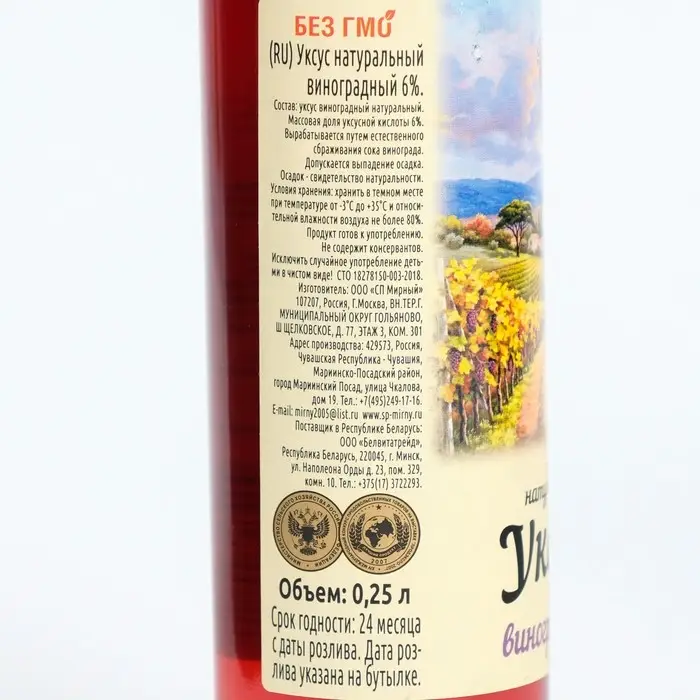 Уксус виноградный натуральный, 6%, 250 мл