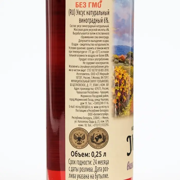 Состав: уксус виноградный натуральный. Массовая доля уксусной кислоты 6%. Вырабатывается путем естественного сбраживания сока винограда. Допускается выпадение осадка. Осадок - свидетельство натуральности.