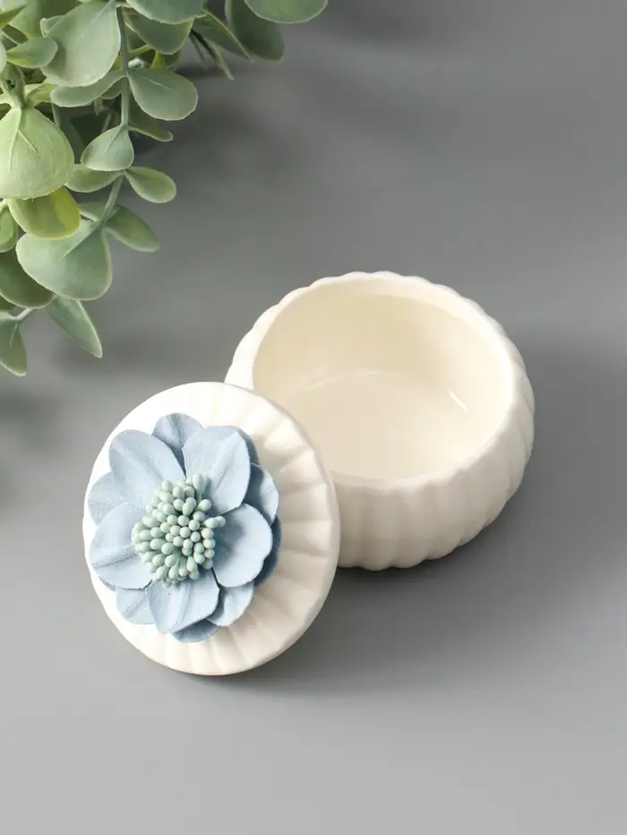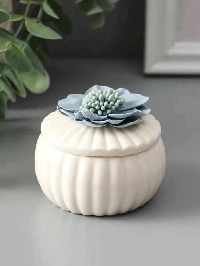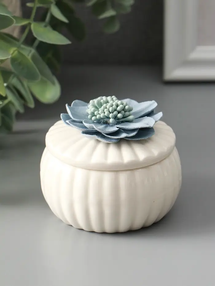 Шкатулка керамика "Голубой цветок" белая 7х7х6,5 см