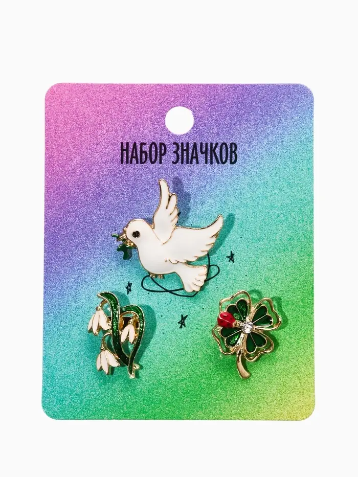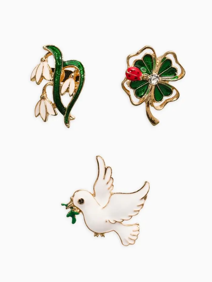 Броши "Голубь, клевер, подснежник" (набор 3шт), цветной в золоте