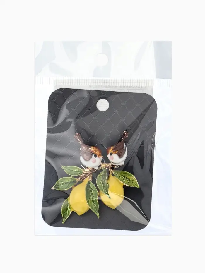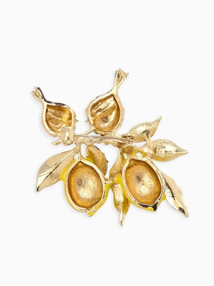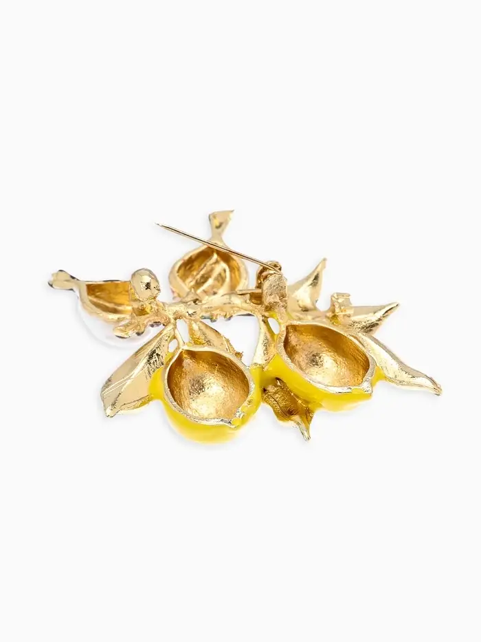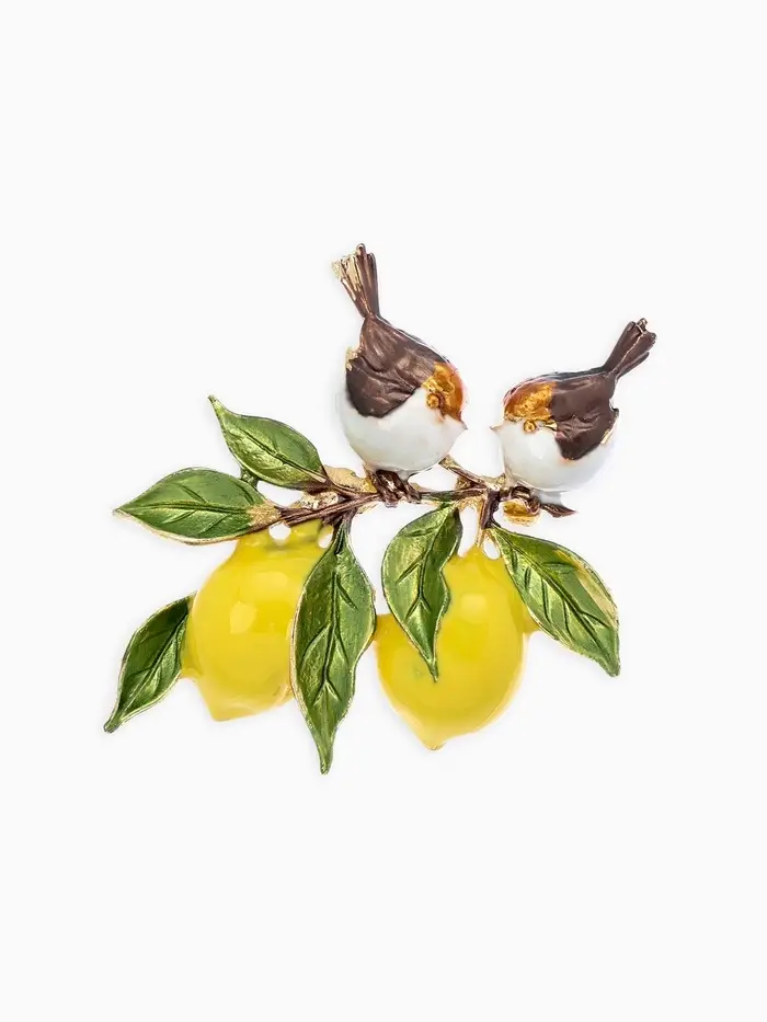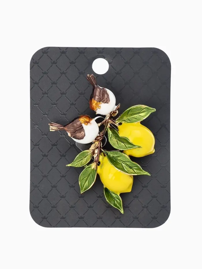 Брошь "Воробьи на ветке лимона", цветная в золоте