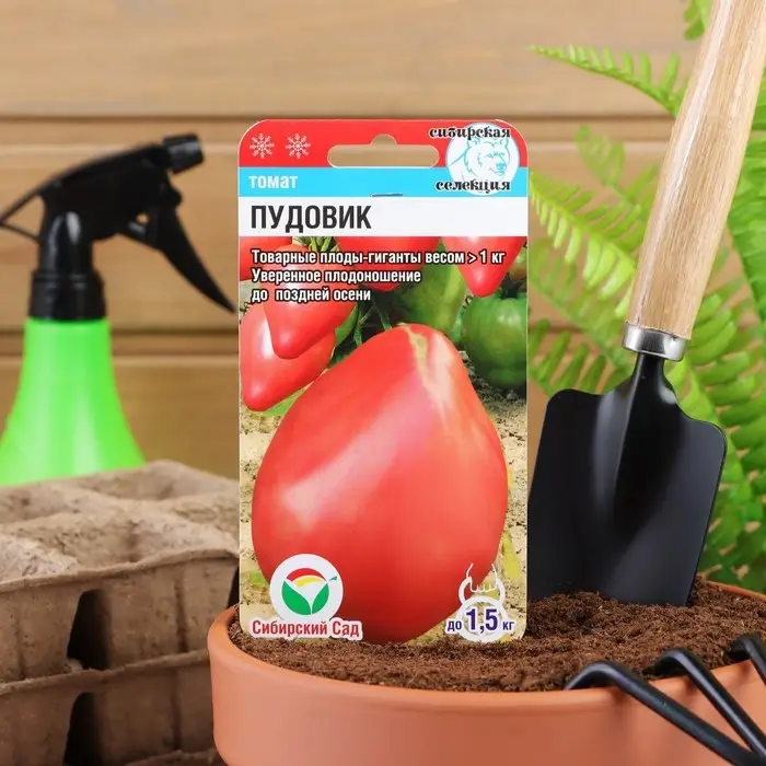 Крупные плоды сердцевидной формы окрашены ярким оттенком малиново-красного. Под их тонкой кожицей скрывается плотная вкусная мякоть. Благодаря повышенному содержанию твёрдых веществ «Пудовик» станет идеальным сырьём для переработки в пасту или томатный сок. Не менее эффектно большие помидоры показывают себя в свежем или консервированном виде.