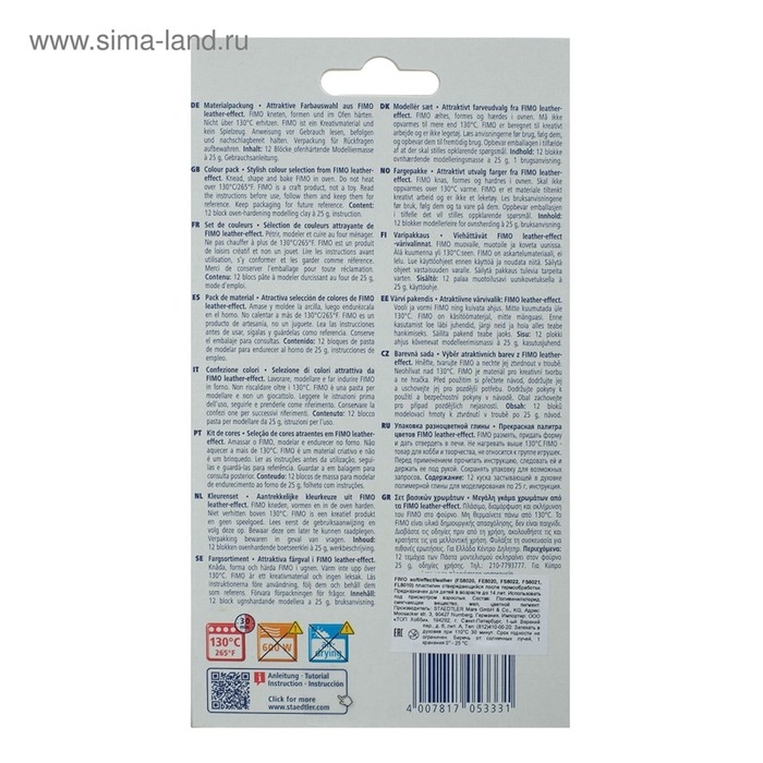 Полимерная глина FIMO Professional подходит для начинающих мастеров и професиональных художников.ОсобенностиМасса мягкая, поэтому вы легко придадите ей нужную форму.Цвета можно смешивать для получения необходимых оттенков, которые сохранятся после обжига.После запекания изделия становятся прочными и долговечными.Упаковка легко открывается без использования ножа. Если вы не полностью израсходовали блок, то остатки можно завернуть в упаковку — так глина лучше сохранится.Термическая обработка. Готовое изделие поместите внутрь духовки на тарелке, стекле или фольге. Запекайте при температуре 110 °С. Чем больше толщина элемента, тем дольше нужно запекать (вплоть до 30 минут). Температура обжига не должна пpeвышaть 130 °С.Пластика рекомендована для детей старше 8 лет.