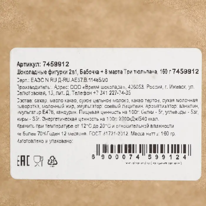 Шоколадные фигурки, 2 в 1 «Бабочка + 8 марта. Три тюльпана», 160 г