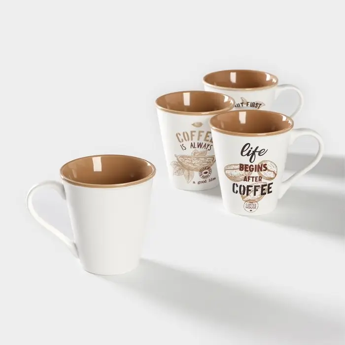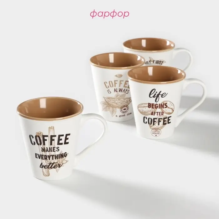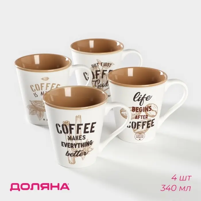 Набор кружек фарфоровых Доляна «Вкусный кофе», 4 предмета: 340 мл