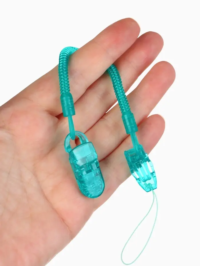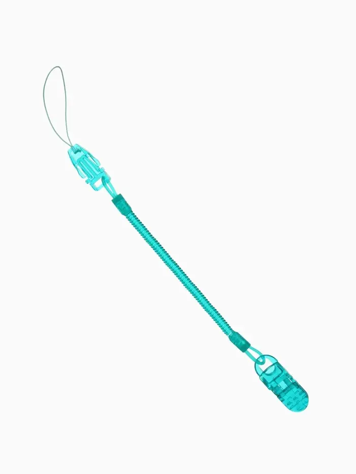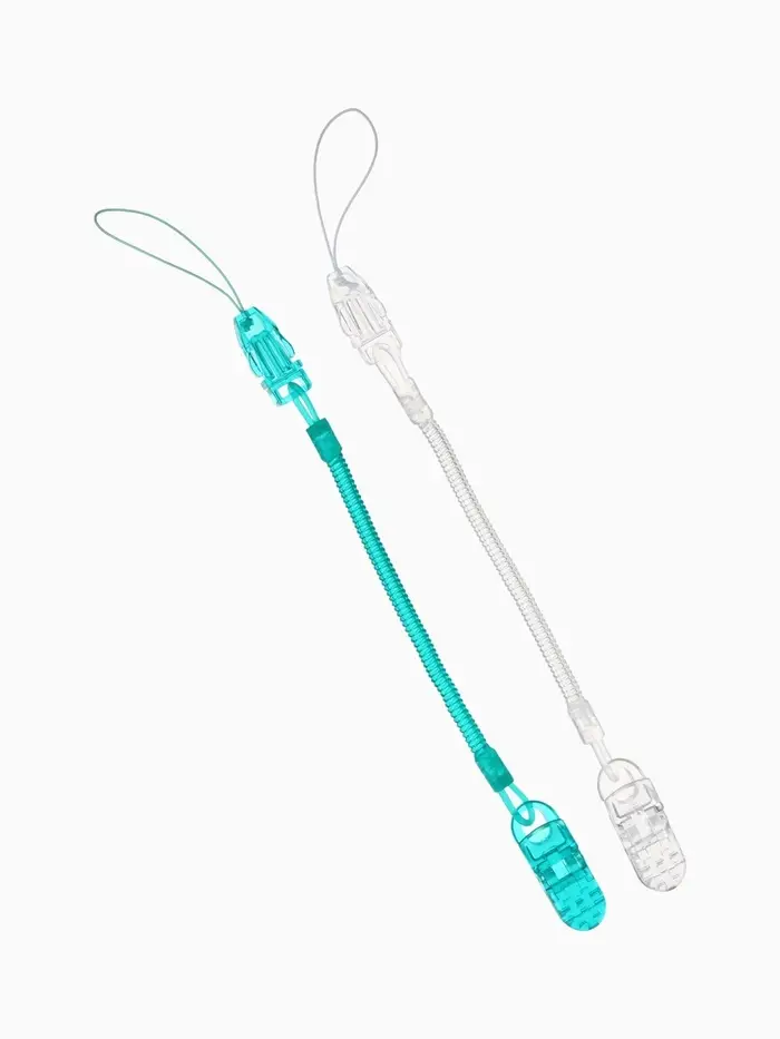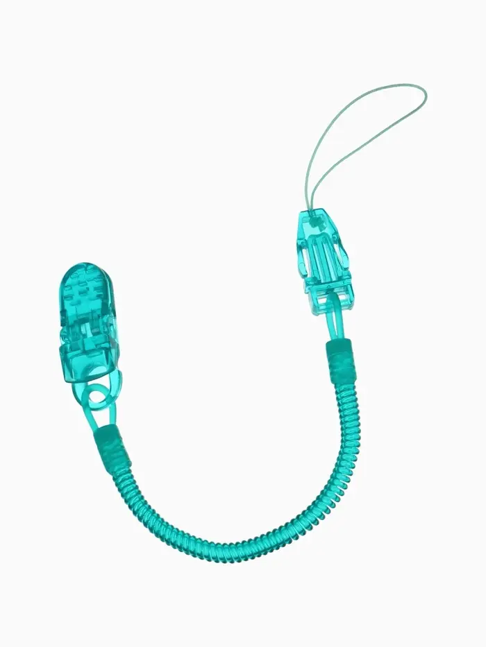 Особенностью держателя является конструкция в виде пружинки, которая обеспечивает высокую эластичность. Благодаря этому тросик удобно адаптируется к движениям ребёнка, предотвращая спутывание и обеспечивая комфорт и безопасность в любой ситуации. Такой держатель помогает всегда держать пустышку под рукой и поддерживать её чистоту.