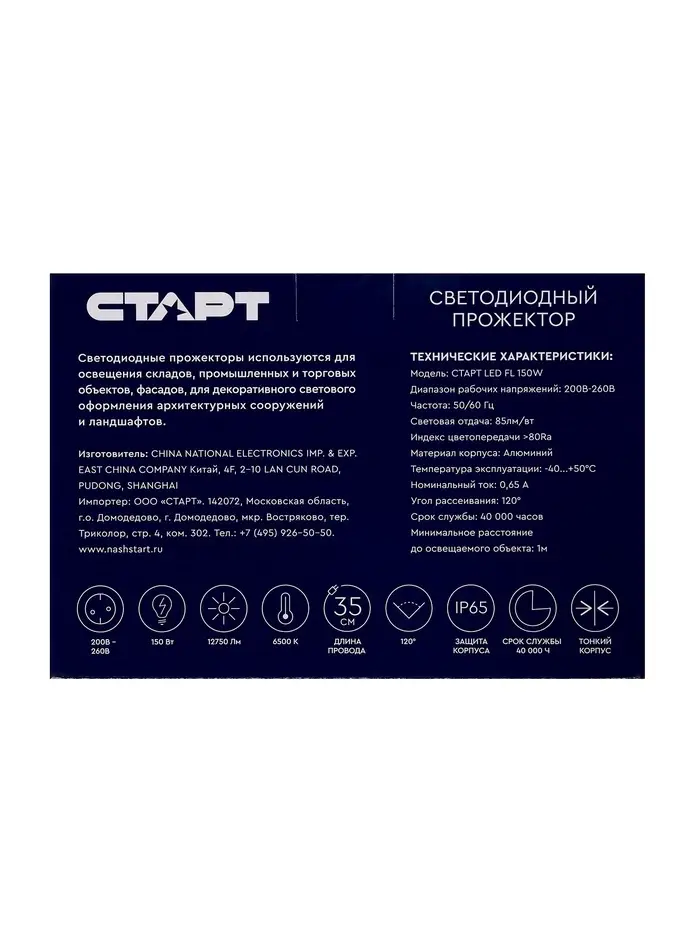 Прожектор светодиодный СТАРТ, 150 Вт, 12750 Лм, 6500К, IP65, чёрный