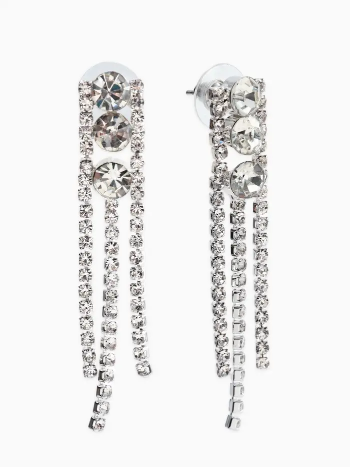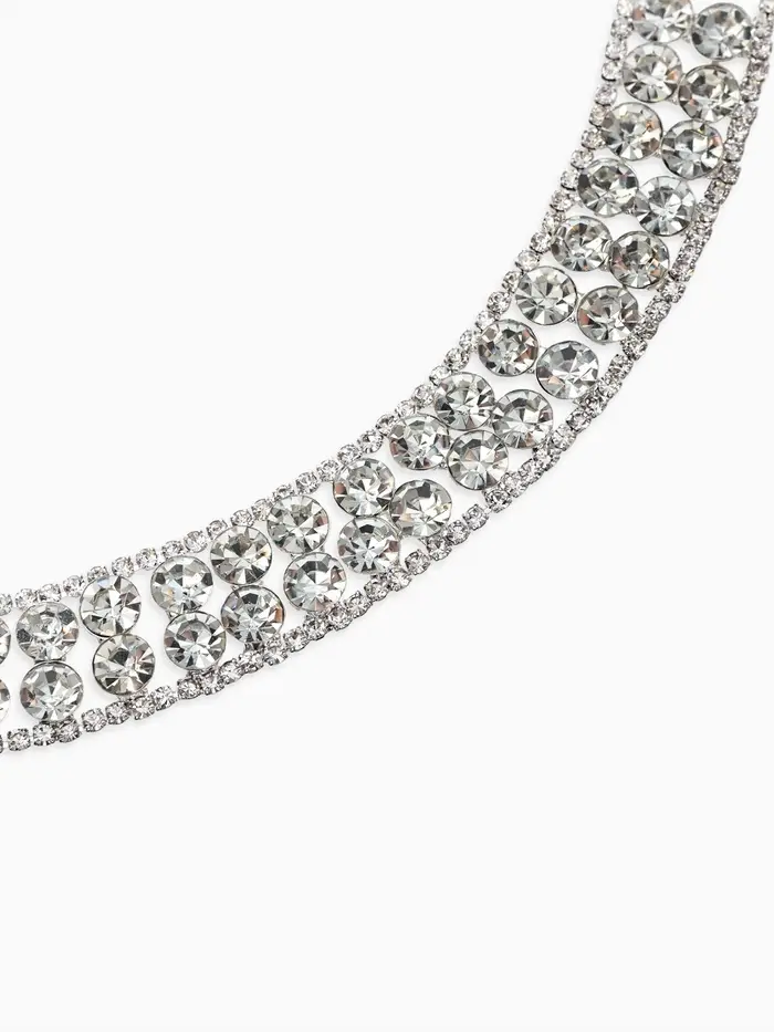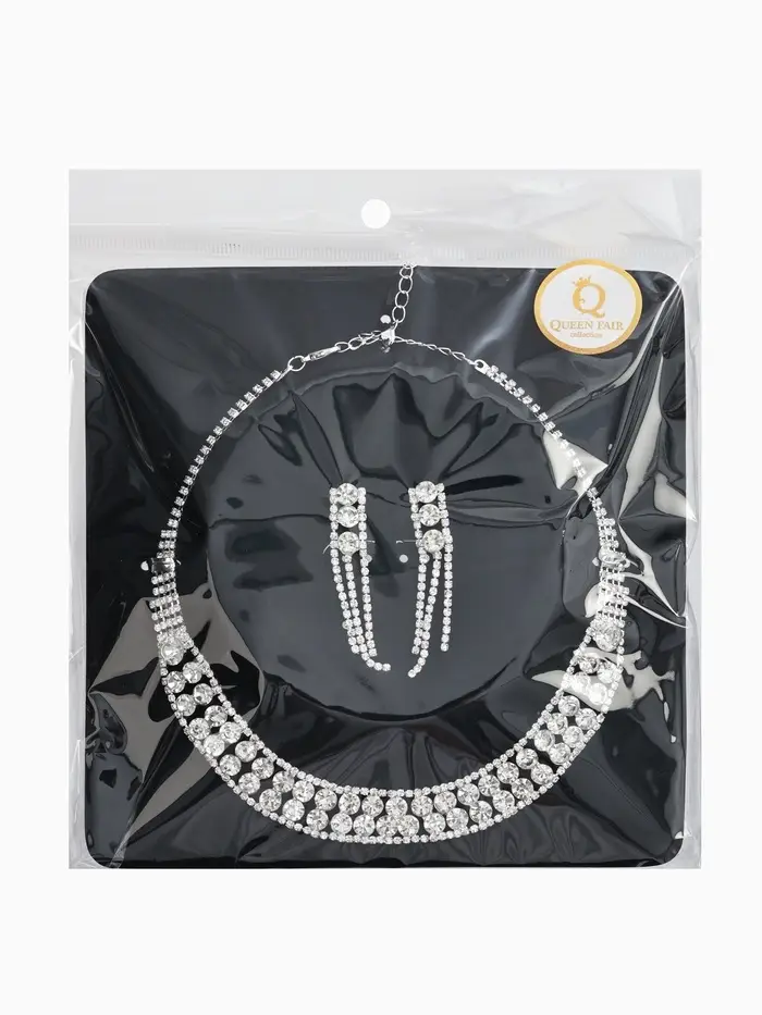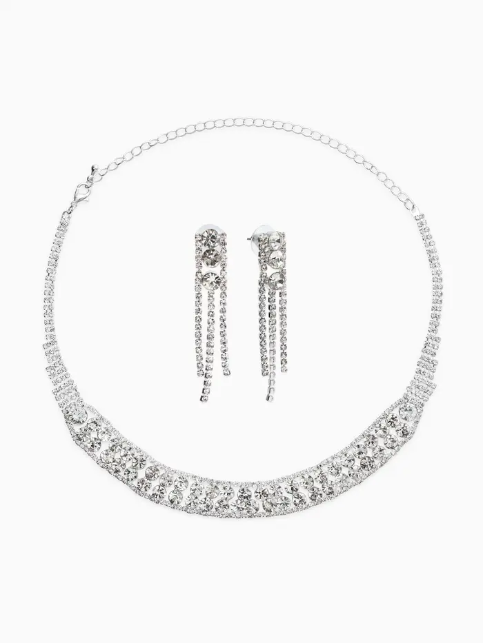 - Щедрое применение: Обилие страз на колье и серьгах эффективно привлекает внимание, подчеркивая шею и зону декольте, мгновенно привлекая интерес собеседников.