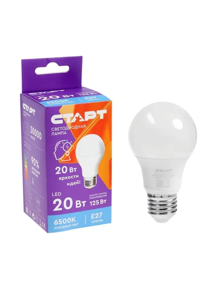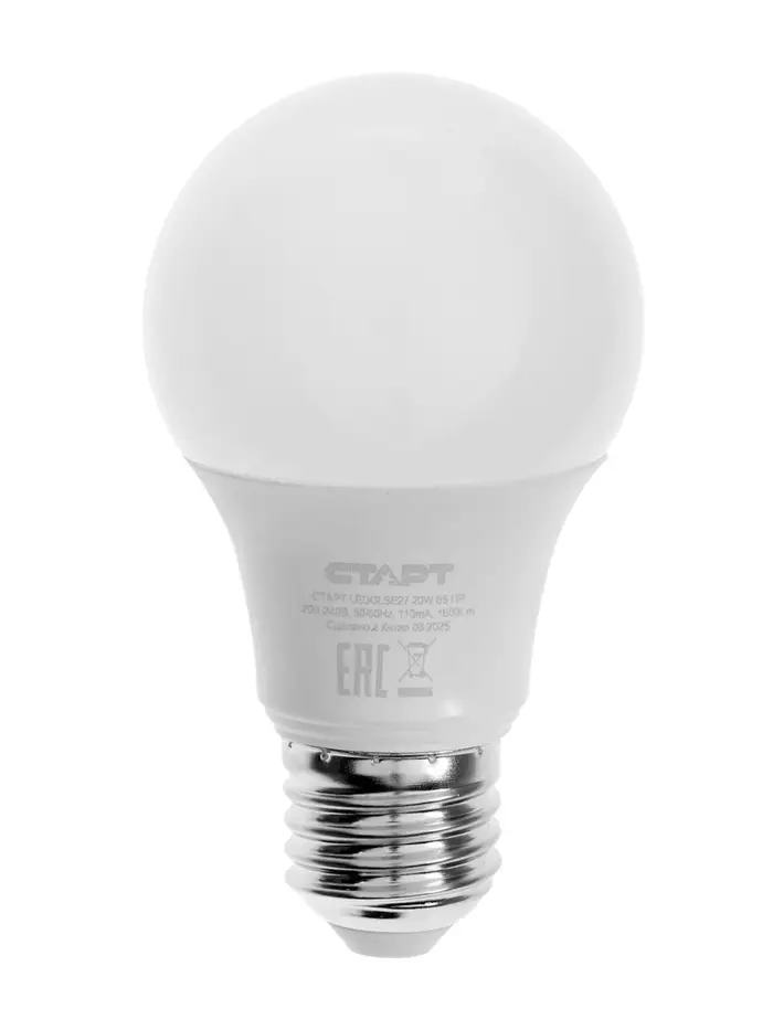 Лампа светодиодная СТАРТ, 20 Вт, Е27, 6500К, 1600 лм, свечение холодное белое