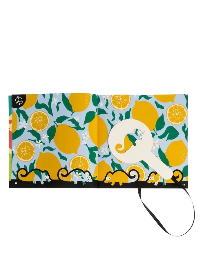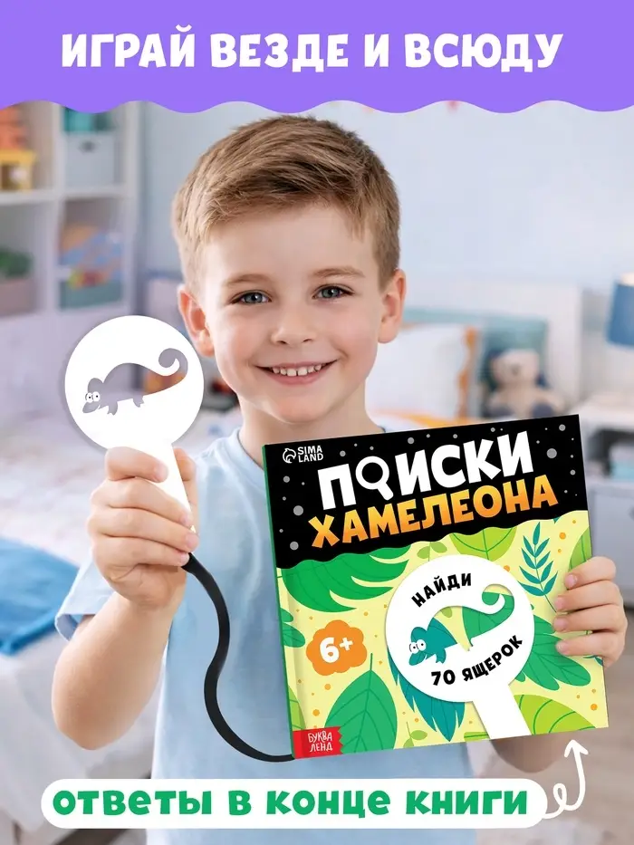Хамелеон спрятался — и только самый внимательный сможет найти его на каждой странице! В комплекте идёт лупа, с которой ребёнок превращается в настоящего следопыта. Яркие иллюстрации полны деталей, сюжетов и забавных персонажей, а поиск хамелеона развивает концентрацию, память и умение замечать мелочи. Это не просто книжка — это квест, который хочется проходить снова и снова.