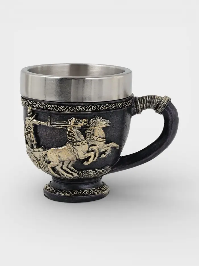 Средневековая кружка с рельефной колесницей — выбор для тех, кто ценит мужскую эстетику без пафоса. Чёрная матовая поверхность подчёркивает глубину выдавленного рисунка, а объём в 300 мл делает её практичной для повседневного использования: утреннего кофе, чая или тёплого напитка после работы. Комбинация нержавеющей стали и полистоуна обеспечивает устойчивость формы и насыщенность деталей.