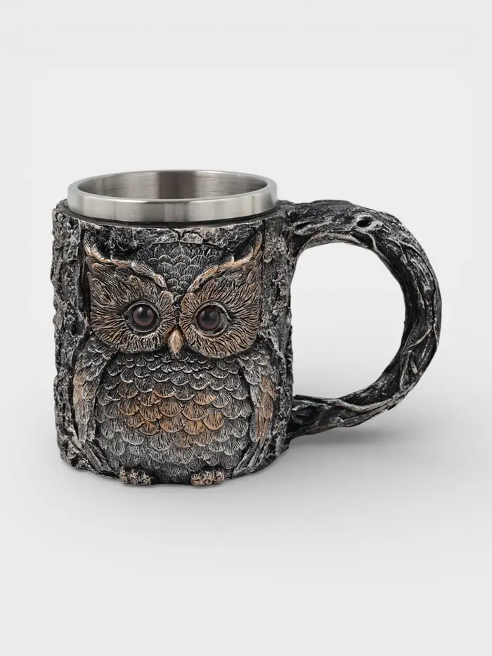 Средневековая кружка с совой — для тех, кто ценит мудрость в деталях. Серебристая поверхность подчёркивает рельефный образ птицы, а объём в 400 мл делает её практичной для утреннего кофе или вечернего чая. Основа из нержавеющей стали обеспечивает прочность, а декоративный слой из полистоуна точно передаёт черты совы — без наклеек, только выдавленный рисунок, который не сотрётся.