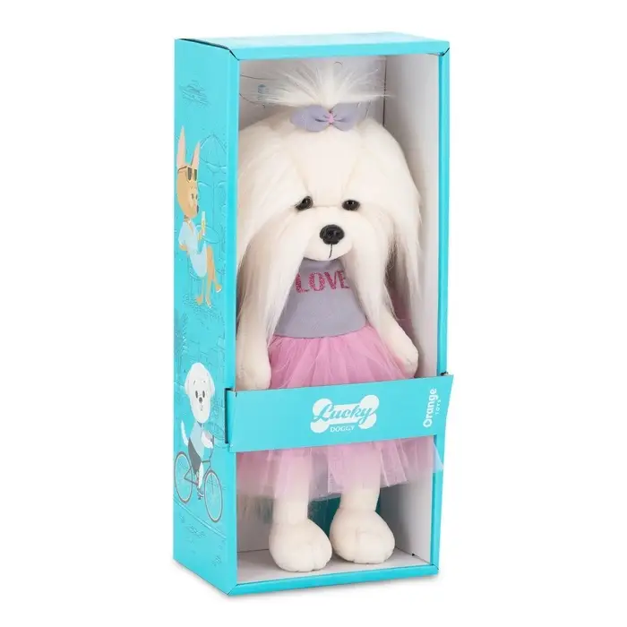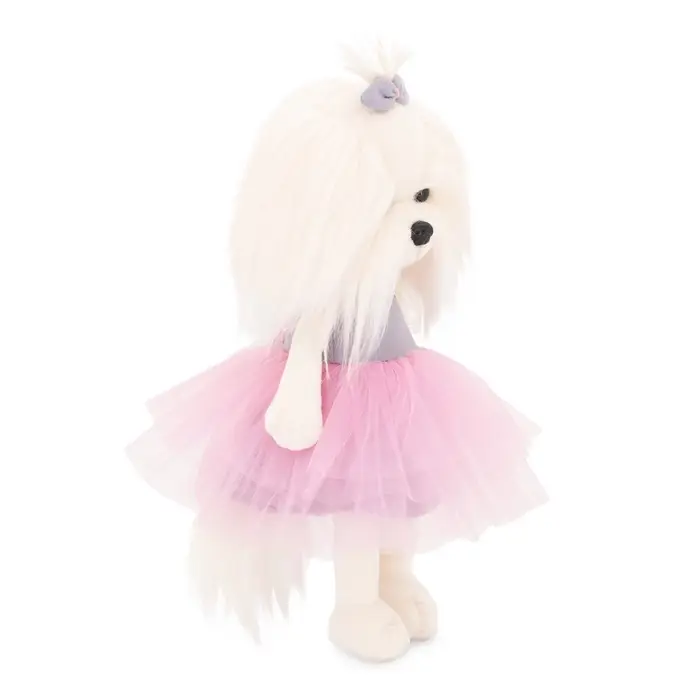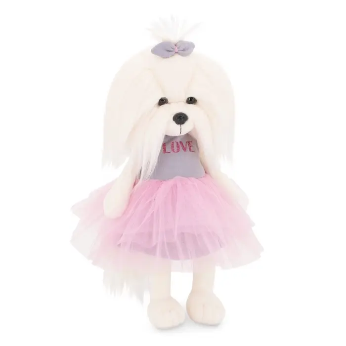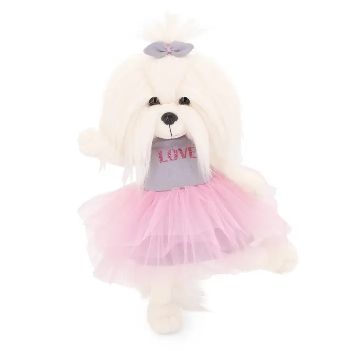 Мягкая игрушка «Стильная собачка в юбке» создана в нежном и романтичном образе. Длинная белоснежная шерсть, аккуратный бантик на голове и пышная розовая юбка из фатина формируют утончённый персонаж, который сразу притягивает взгляд. Надпись LOVE на платье добавляет образу лёгкий модный акцент и делает игрушку особенно выразительной.