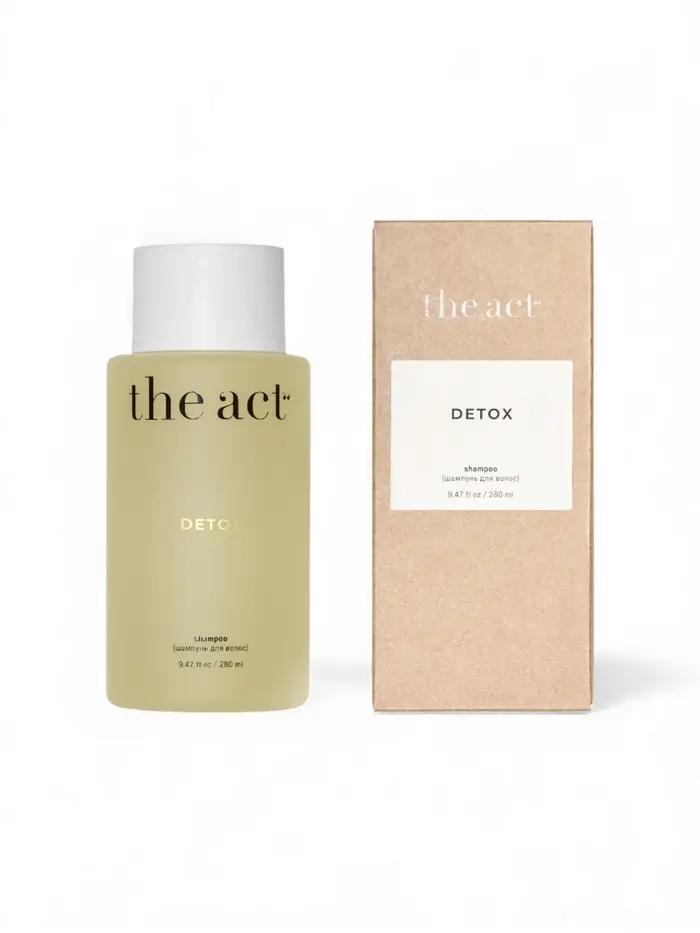 Глубоко очищающий шампунь DETOX с яблочным уксусом и гидролизованным кератином The Act, 300 мл — эффективное средство для глубокого очищения волос и кожи головы. Шампунь мягко удаляет загрязнения, излишки кожного жира и остатки стайлинговых средств, не повреждая структуру волос. Волосы становятся более мягкими, блестящими и оживлёнными.