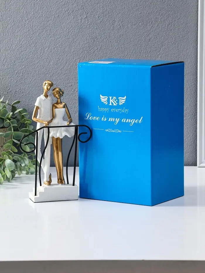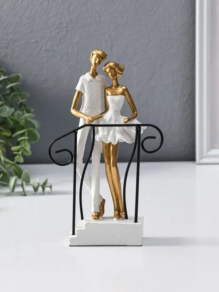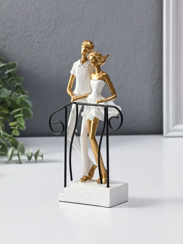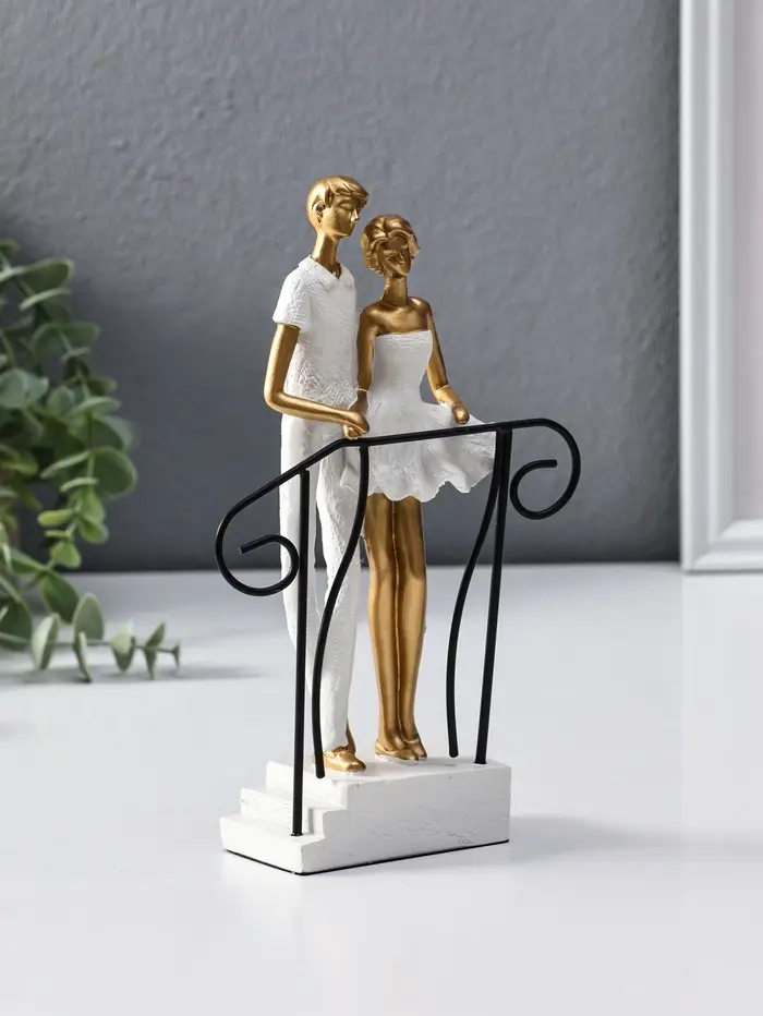 Сувенир полистоун "Парочка стоит на лестнице с перилами" бело-золотой 4,4х12,5х21 см