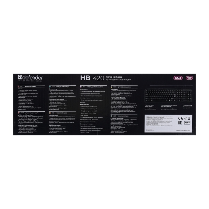 Defender HB-420 с подключением по USB выполнена в черном корпусе. Благодаря полноразмерной раскладке клавиш вы сможете обеспечить комфортный процесс печати, ведь будете легко попадать по кнопкам. Регулировка угла наклона устройства доступна за счет поддержки регулируемых ножек.