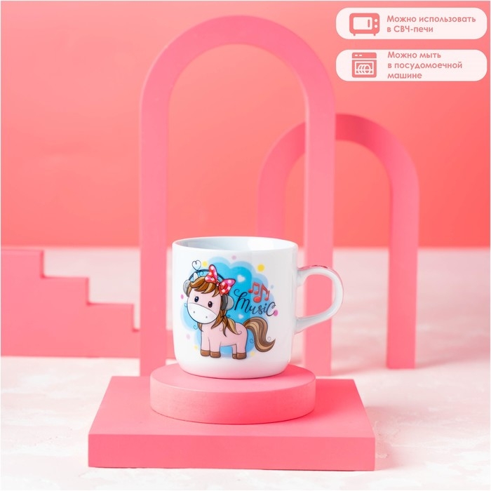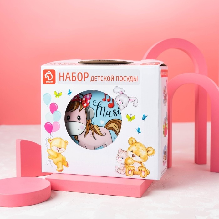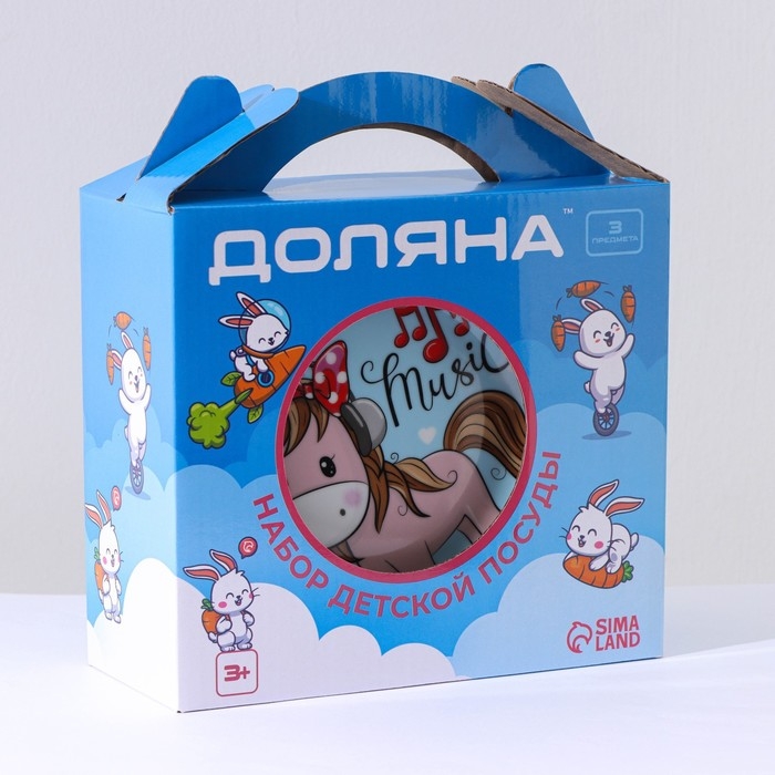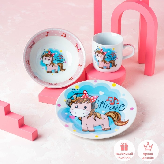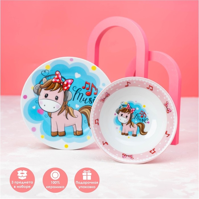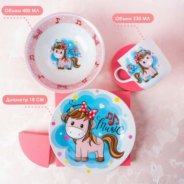 Набор детской посуды из керамики Доляна «Маленькая лошадка», 3 предмета: кружка 230 мл, миска 400 мл, тарелка d=18 см, цвет белый
