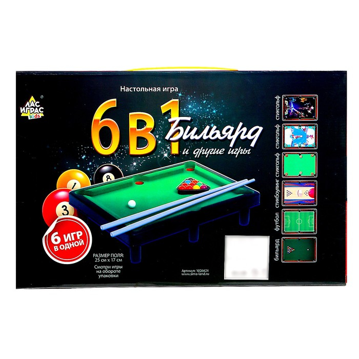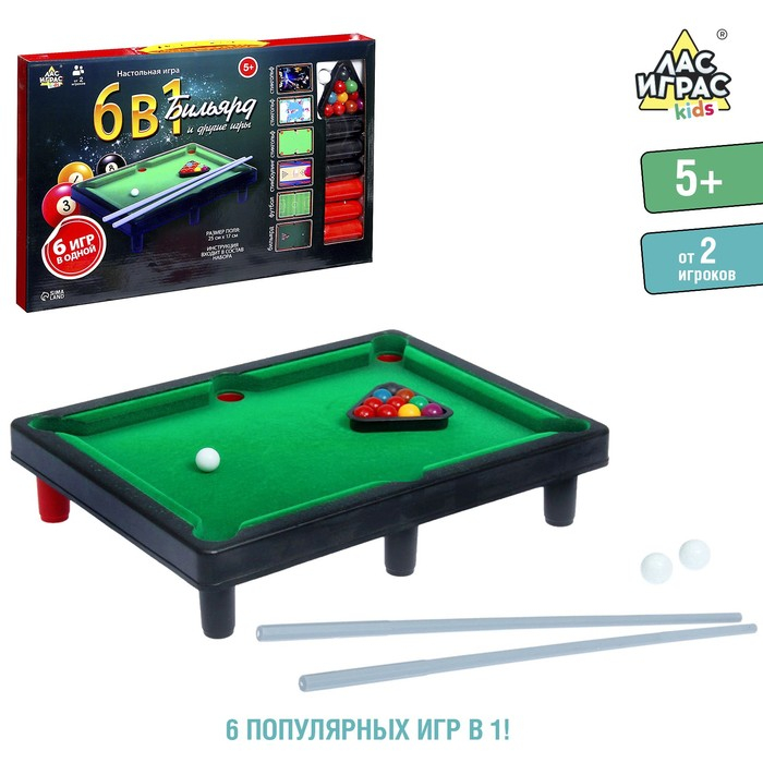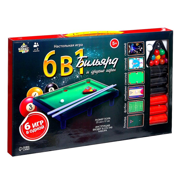 Настольный бильярд «6 в 1: бильярд, стикбол, стикбоулинг, стик гольф, фингербол», от 2 игроков, 5+