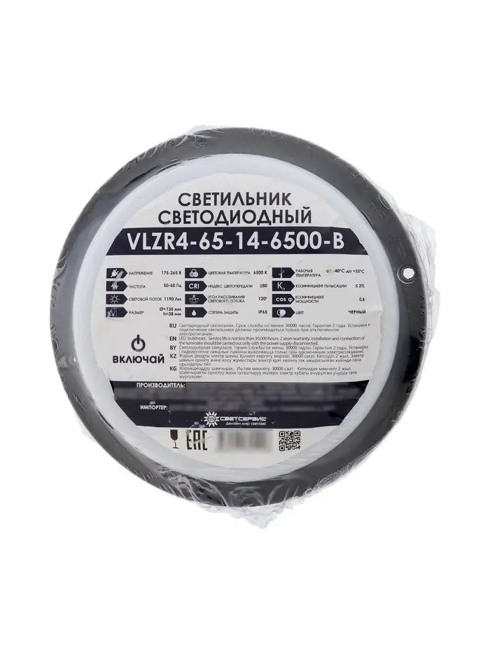 Светильник светодиодный Включай герметичный, 14 Вт, 1190 Лм, IP65, 6500К, круг, черный