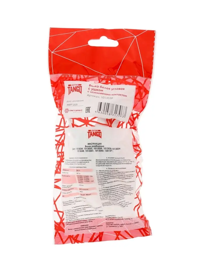 Вилка угловая с ушком TANGO, 16 А, 250 В, IP 20, с заземлением, белая, индивидуальная упаковка 10981