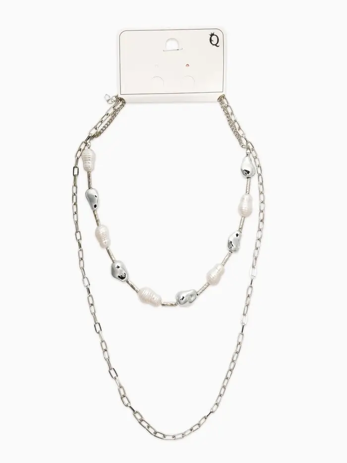 Колье "Жемчуг" борокко, цепь, удлиненное, 2 яруса, цвет белый в серебре