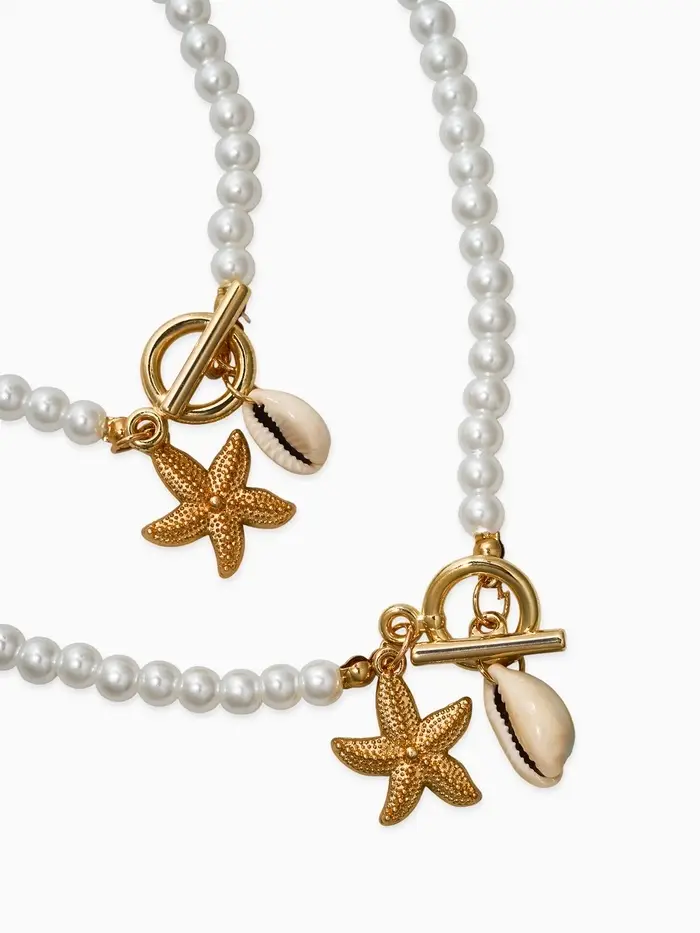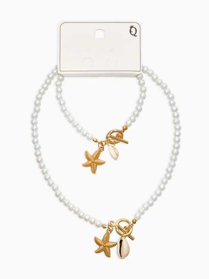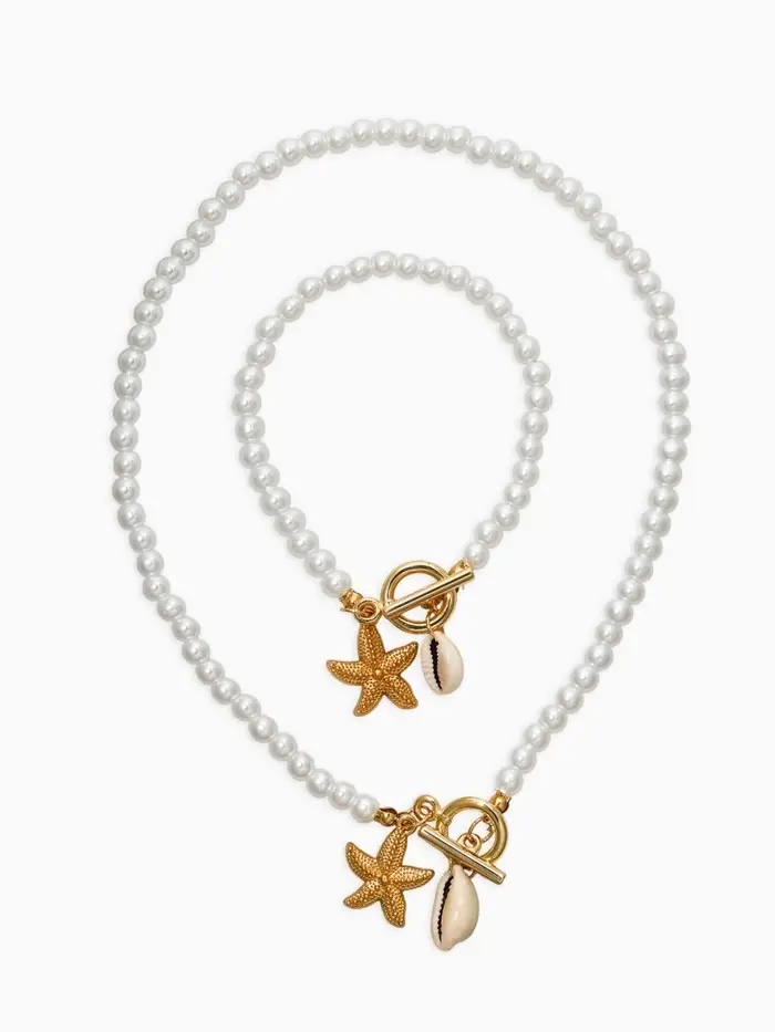 Набор 2 пред-та: бусы.браслет "Жемчуг", звезда, цвет белый в золоте L=18/42см №6
