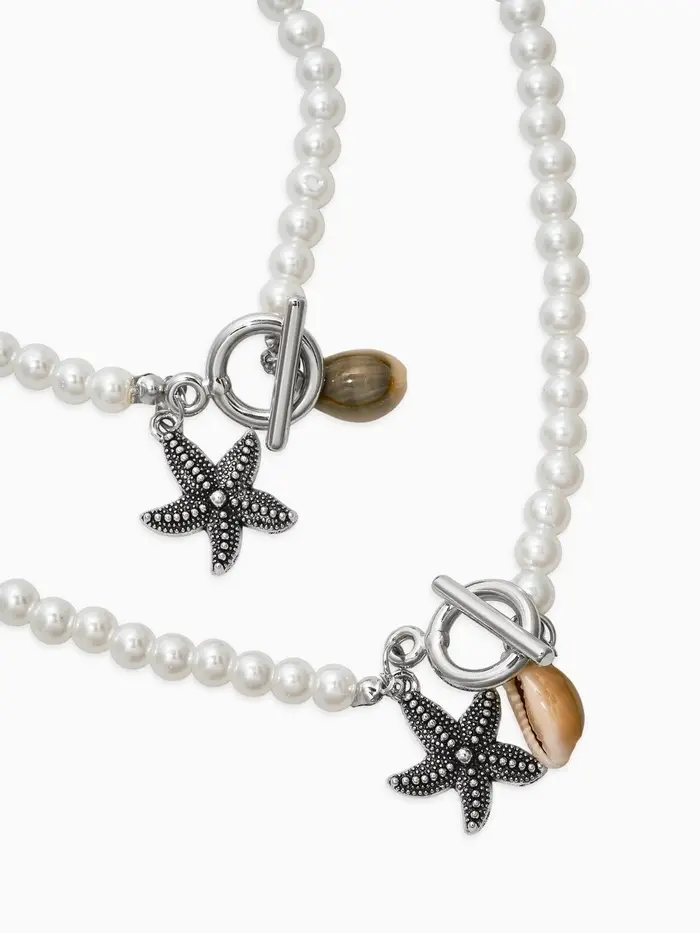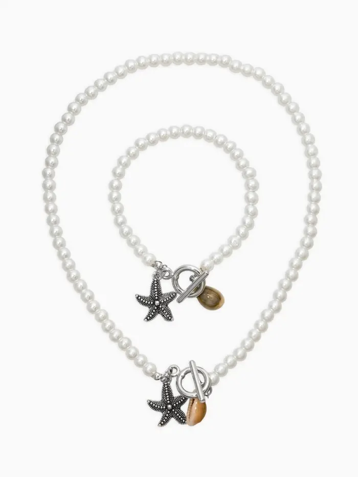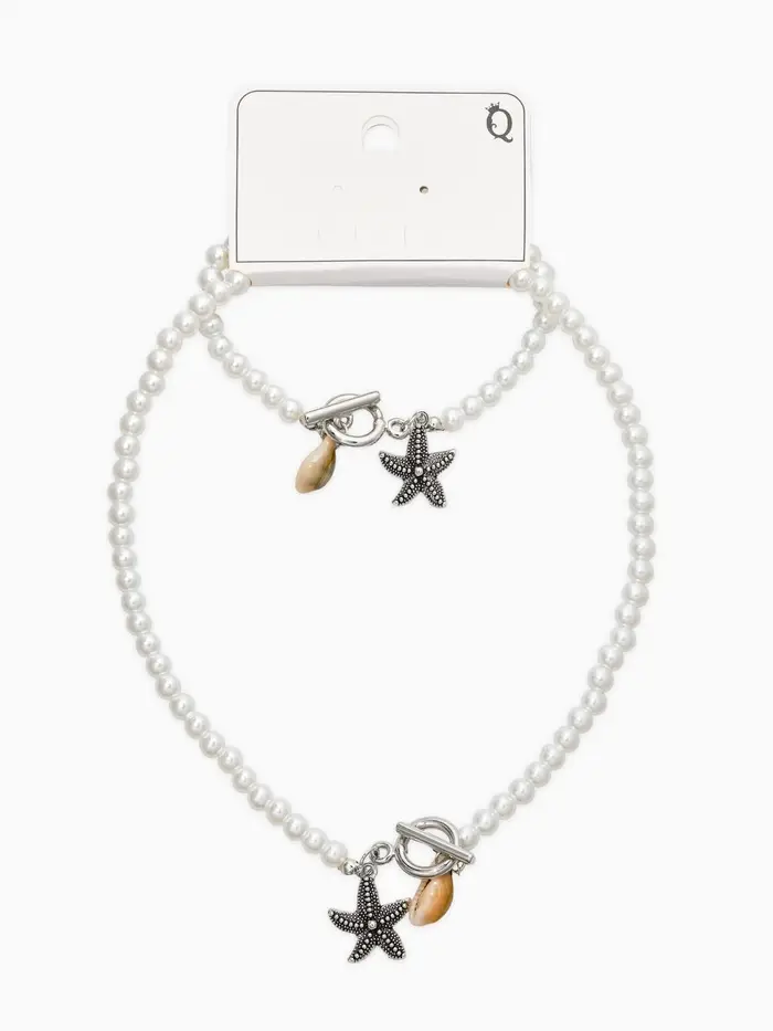 Набор 2 пред-та: бусы.браслет "Жемчуг", звезда, цвет белый в серебре L=18/42см №6