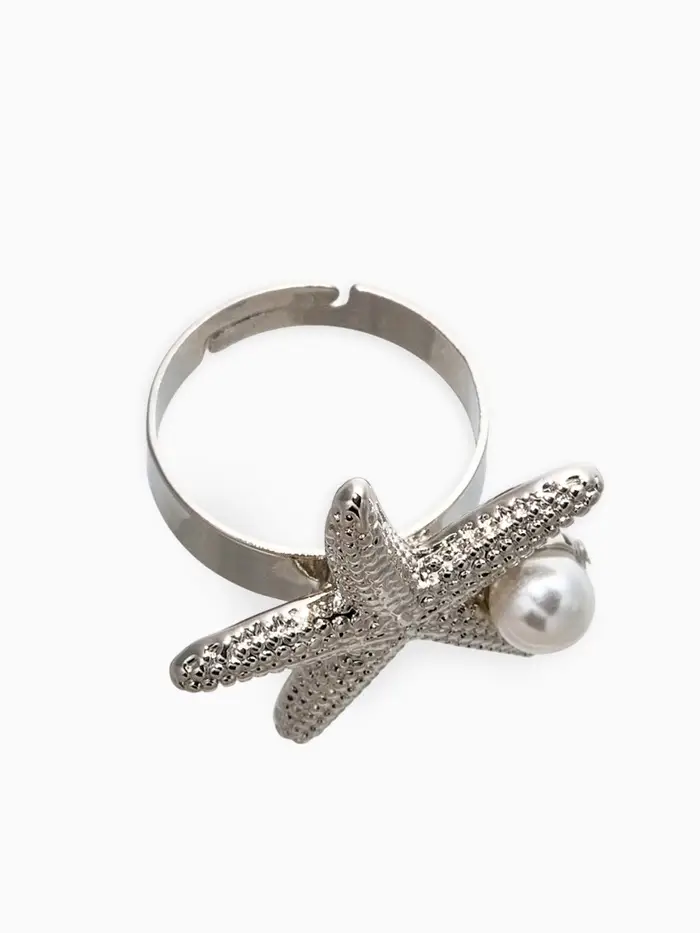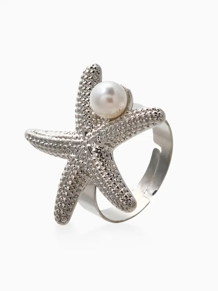 Кольцо "Морская звезда" с бусиной, безразмерное, цвет белый в серебре