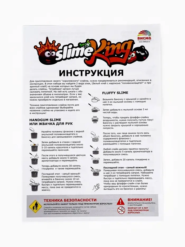 Набор позволяет сделать разнообразные слаймы — каждый будет уникальным. Все ингредиенты легко смешиваются, а простая инструкция делает процесс понятным даже для новичков. Это отличный способ развить фантазию, моторику и провести время весело и с пользой.